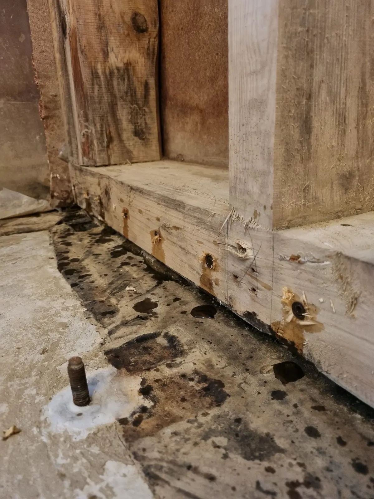 Allerdings gibt es ein Konstruktionsdetail, das besonders beachtet werden muss. Beim Bau des Hauses wird die Schwelle im Lot ausgerichtet. Dazu liegt sie in den allermeisten Fällen nicht auf dem Betonboden auf, sondern wird mit Holzkeilen über dem Betonboden fixiert. Nachdem die Konstruktion ausgerichtet ist, wird mit Zementmörtel von außen die Schwelle unterfüttert. Das geschieht in aller Regel nur in den äußeren 2-3 cm vom Schwellenrand nach innen. In der Mitte bleibt eine Luftschicht offen, die jetzt voll Wasser sein kann.