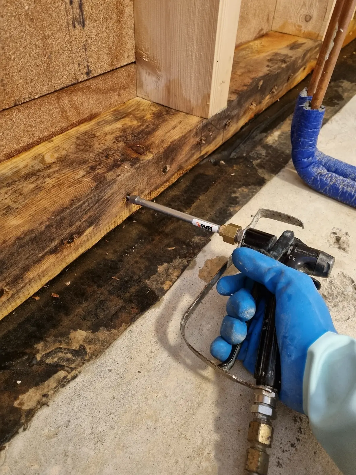 Es gibt aber auch Anwendungen für diese Imprägniermethode, die von unseren Wettbewerbern nicht eingesetzt wird. Bei der Holzrahmenbauweise nach Leitungswasserschäden lässt sich so die Schwelle der Holzkonstruktion schützen. Hierzu finden Sie weitere Informationen auf dieser Seite unter der Rubrik „Pilzschäden an Holzrahmenbauweise nach Wasserschäden“.